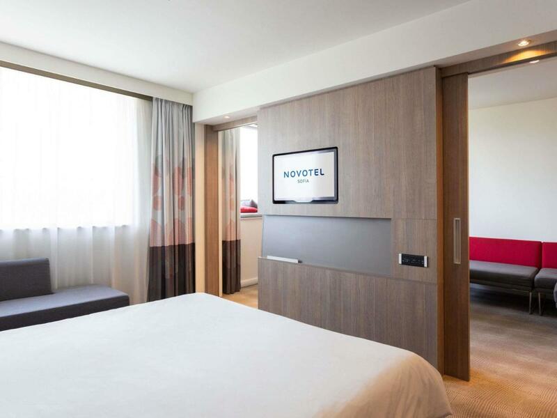 Camerele spațioase de la Novotel Sofia au aer condiționat, TV LED cu ecran plat cu canale prin satelit, cafea și apă minerală gratuite și baie în stil modern. Cele mai multe camere oferă vedere frumoasă la oraș sau Muntele Vitoșa.